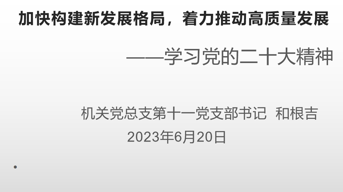 根据机关党总支安排,经支部研究,6月20日在学校事务管理中心201党员活动室组织全体党员干部职工开展了6月政治理论学习,理论学习后党支部书记和根吉对全体党员开展了题为“加快构建新发展格局 着力推动高质量发展——学习党的二十大精神”的专题党课。