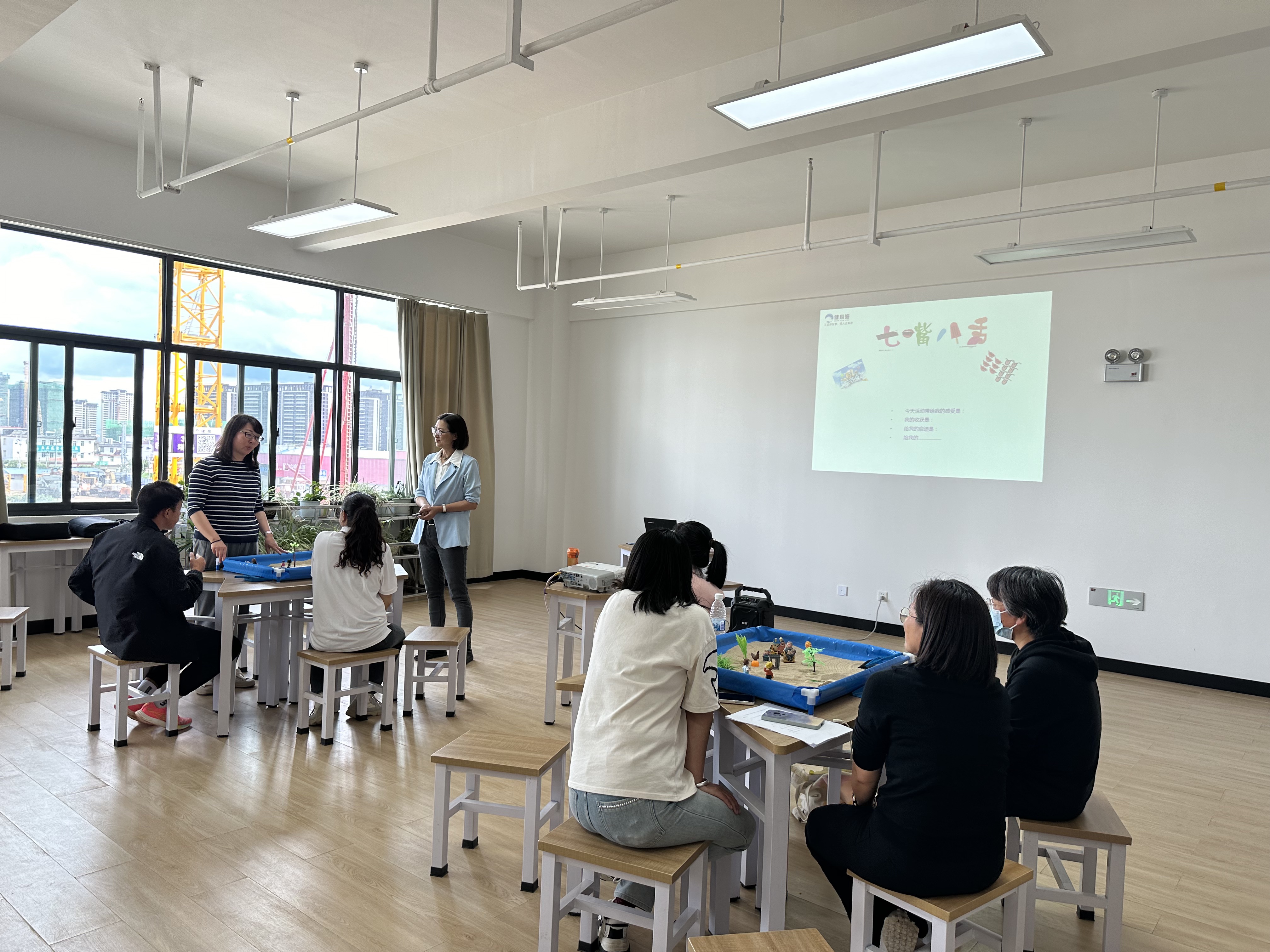 一沙一世界,一人一故事。随后,杨教授以“难忘的暑假”为主题引导大家走进冥想与沙盘的世界。大家以小组为单位,认真听从杨教授的指导,在互相不交流的前提下,挑选自己喜欢的沙具,并按照自己喜欢的方式进行摆放,分别构建属于自己的独特沙盘。然后依次进行几轮,共同完成小组沙盘建设。团队成员们对最后拼成的场景进行分析,互相分享自己的选择以及在这个过程中的真切感受。